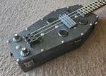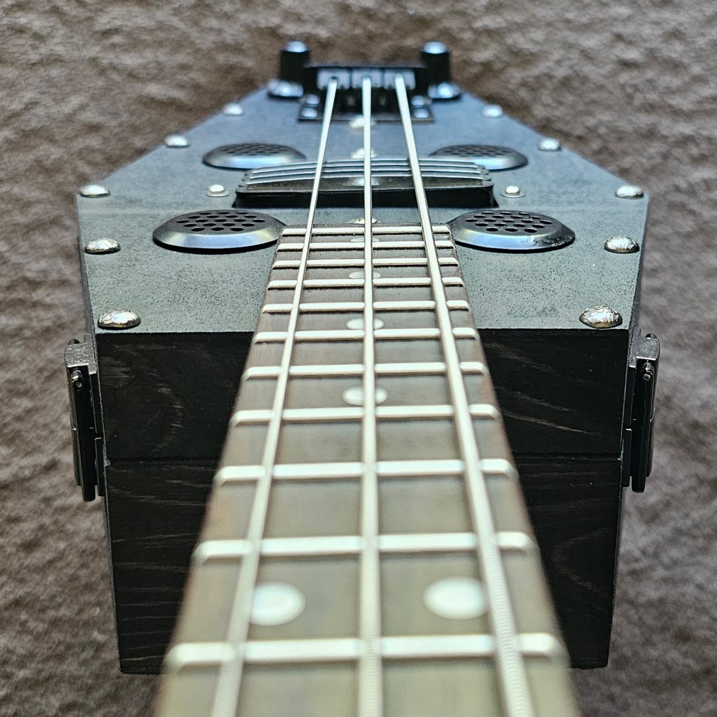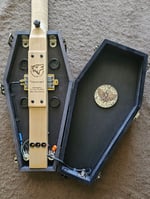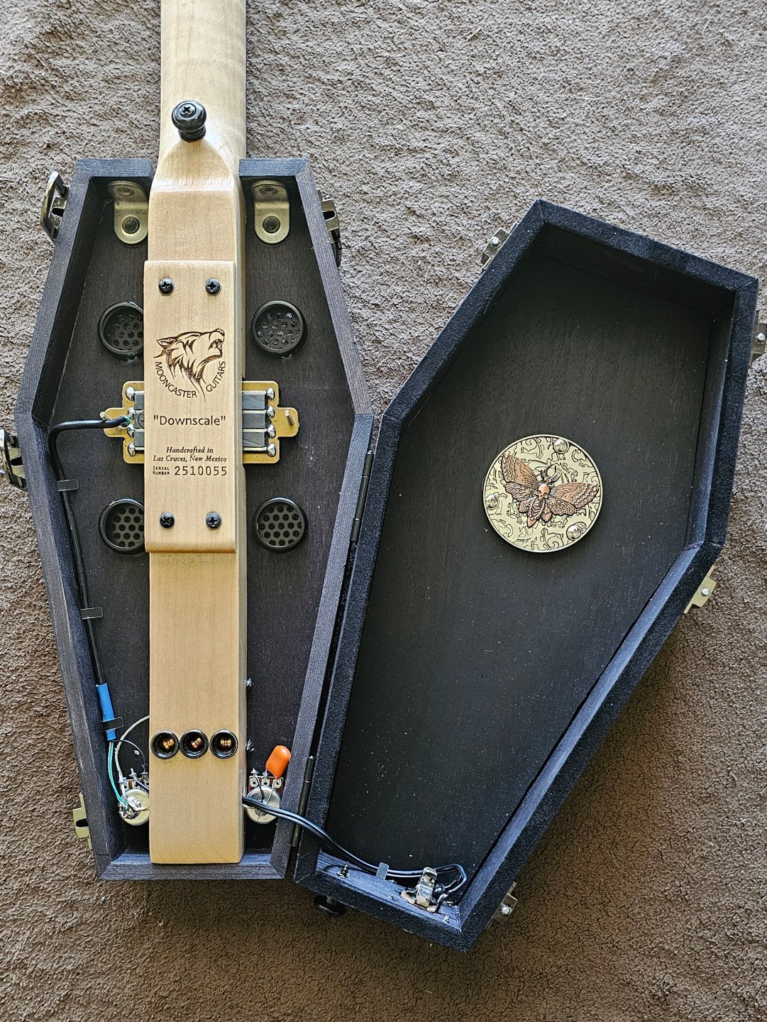 The coffin box is pine, stained black with the face painted flat black. The face of the headstock is also painted flat black and features black hardware with flashes of chrome throughout. The neck is hard maple with some lovely quilting going on. The truss rod under the rosewood and neck through body construction carries the tension of those heavy gauge strings. Four soffited soundholes surround that incredibly responsive four-blade humbucker that can be dialed with tone and volume controls. Inside the box is a death's head moth medallion mounted on a blackened walnut backing. It's all appropriately brutal.