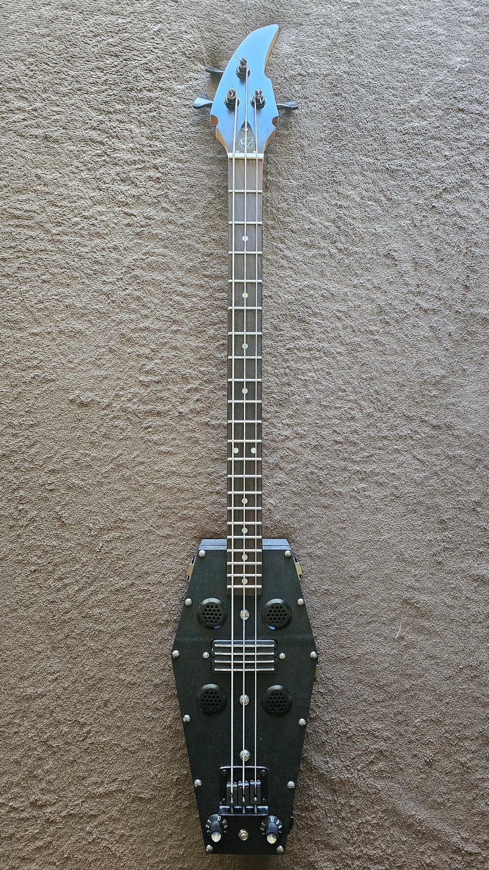 The playing range is somewhere between a detuned guitar and a bass. The scale length is a standard guitar length at 25.5 inches but carries heavier bass strings. The action is low. The tone is focused and tight with nice attack without sacrificing the bottom end, aaaand it responds well to overdrive without being all boomy. It growls.