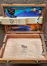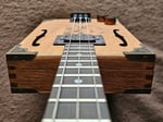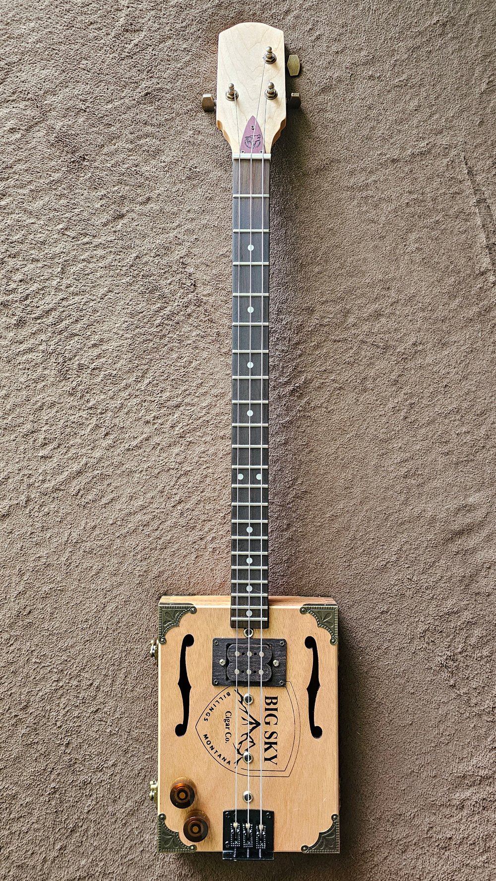 Built on a Big Sky Bitteroot cigar box, this lefty features laser cut f-holes, a three pole humbucker pickup, brass hardware, a purpleheart truss rod cover and red amber capped tone and volume controls. The tone is clean, resonant, bright, with enough kick to carry any song you can think of playing.
