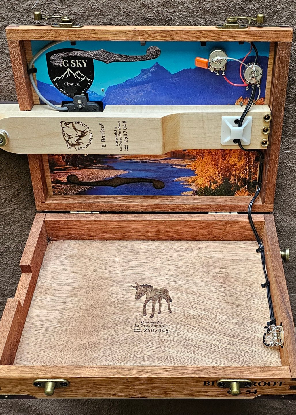 "El Borrico" is a traditionally-styled cigar box guitar with a mighty kick. This lefty custom build is a riff of a previous build and has many of the same features and sound qualities of "The Mule".