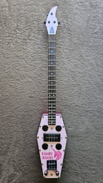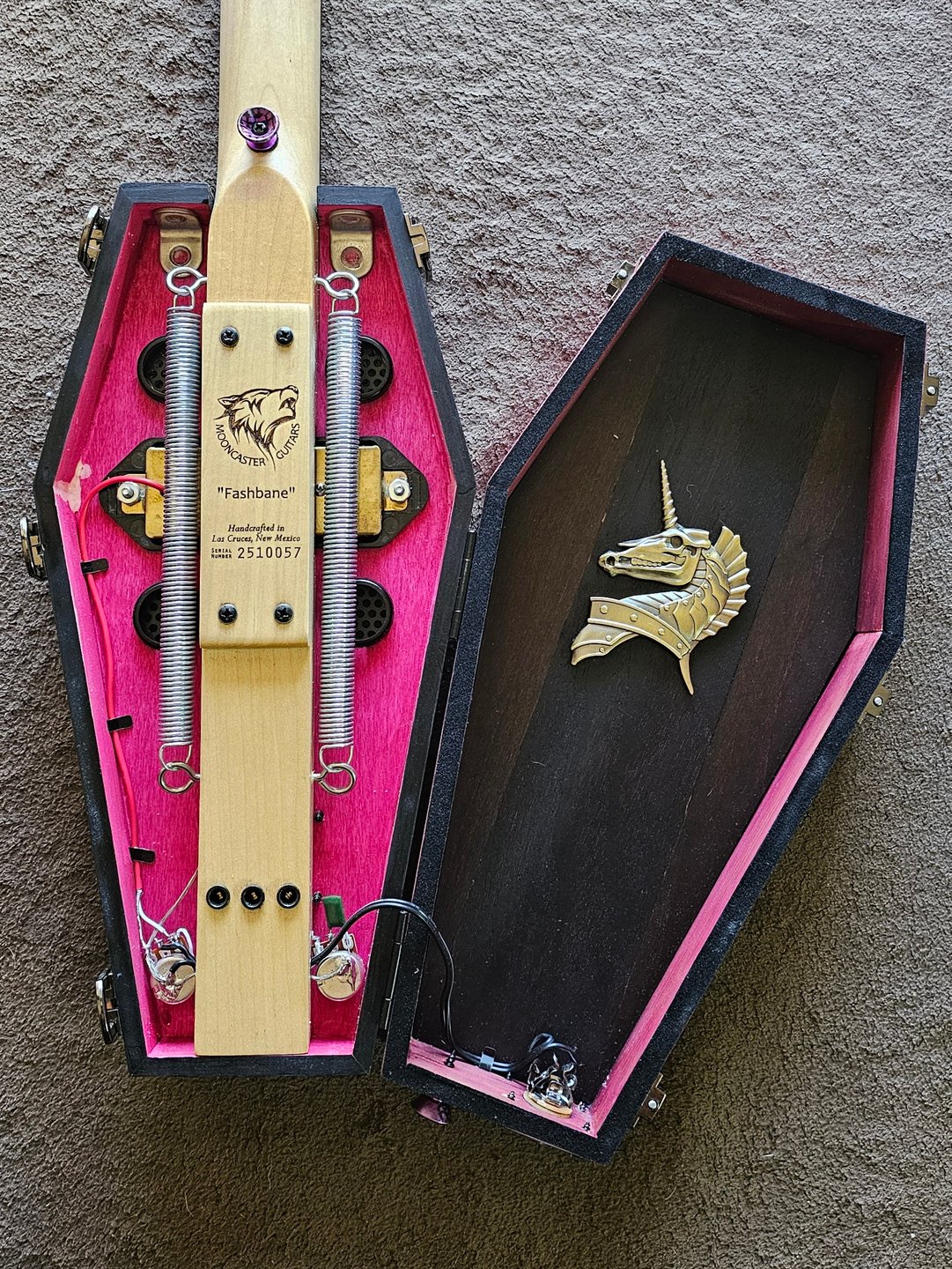 It's a sign of interesting times when I choose to create a bright pink coffin build with Auntie Fash - this three stringer is built to howl, growl, sing, and otherwise cause good trouble. Included is a special voodoo doll and pin tucked inside to stab at the black heart of these interesting times!