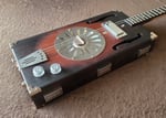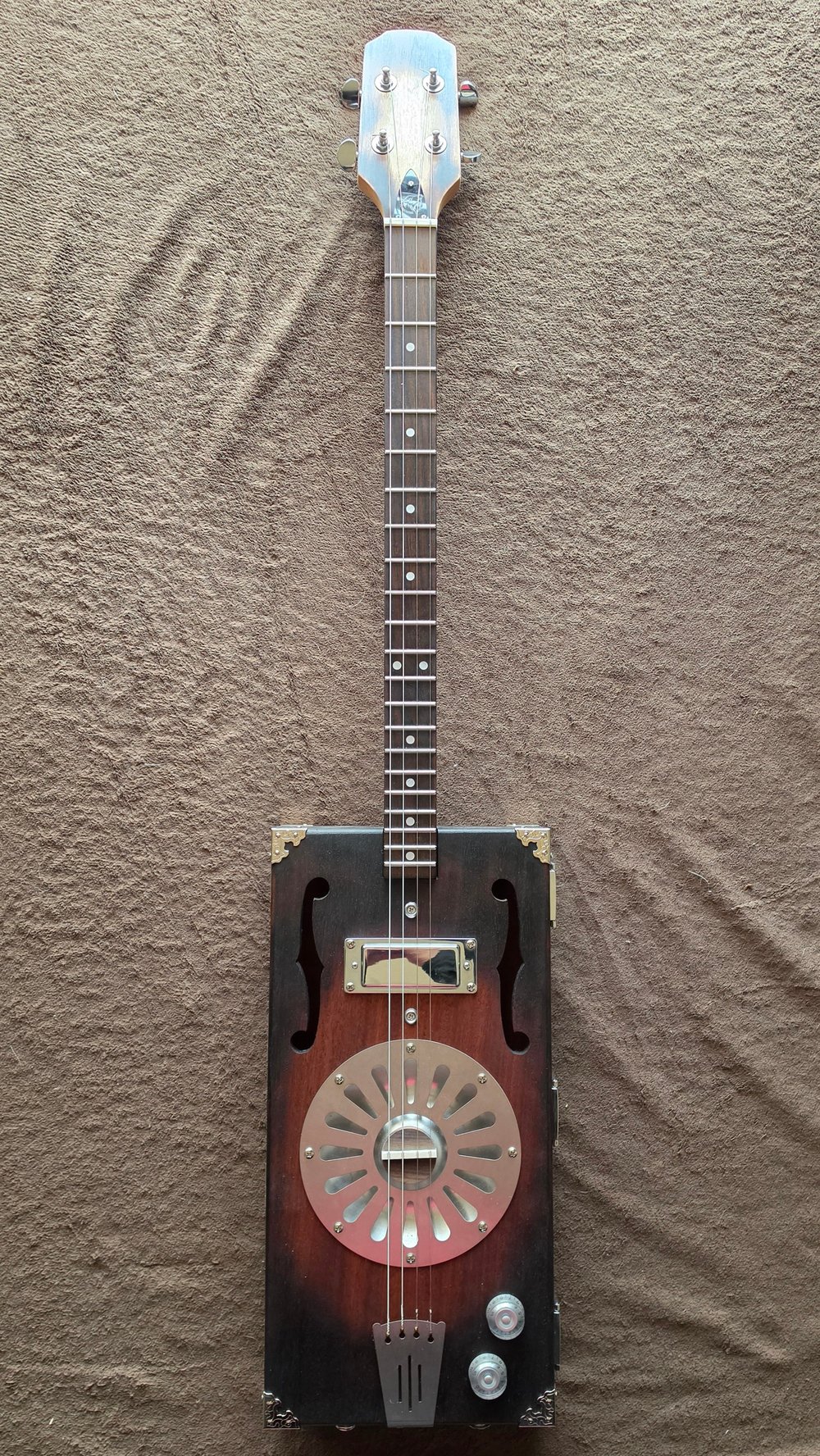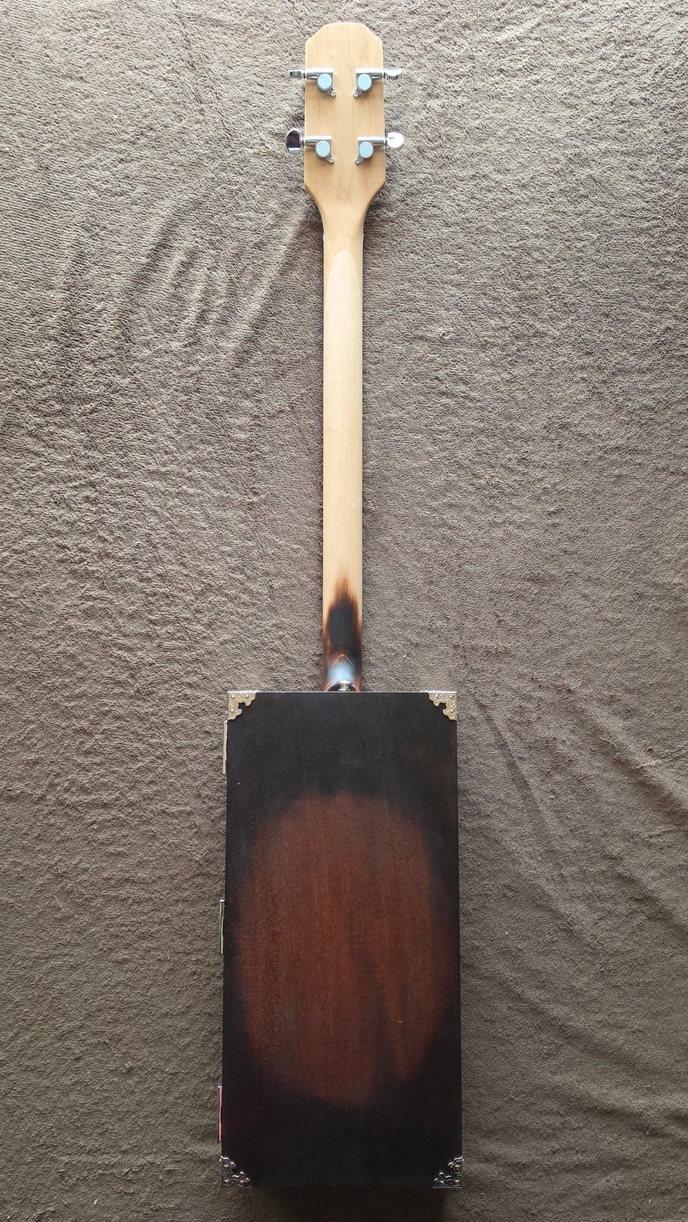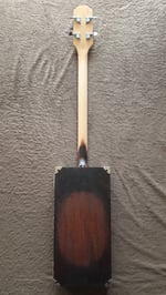 This a custom build using a mahogany box provided by the customer. That box once housed a Smith & Wesson gun cleaning kit and dates back to 1976. It is very sturdy, well aged and seasoned and has a nice resonance, but with four strings I felt it still needed some maple bracing under the hood. The sunburst was applied with a combination of red cherry stain and a torch, and a similar treatment was used for the face of the headstock. The truss rod cover is laser cut and engraved and silver hardware can be found throughout this instrument. The snakeoil humbucker is buttery smooth and quiet and faithfully reproduces the unique tones this guitar produces.