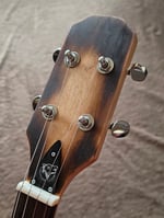 New for this year and going forward with all future builds, the serial number and name information is laser engraved on separately mounted wooden plate on the bottom of the box rather than directly engraved on the neck as I've done in the past. I went with a lighter gauge string set (36/26/17/13) to let that resonator vibrate and tuned it to a very "traditional" GDGB. String action is low and the intonation is dialed in and plays nice and smooth. Yeah, it sounds like a resonator, with good sustain and a rich twangy tone that is reminiscent of a good banjo.