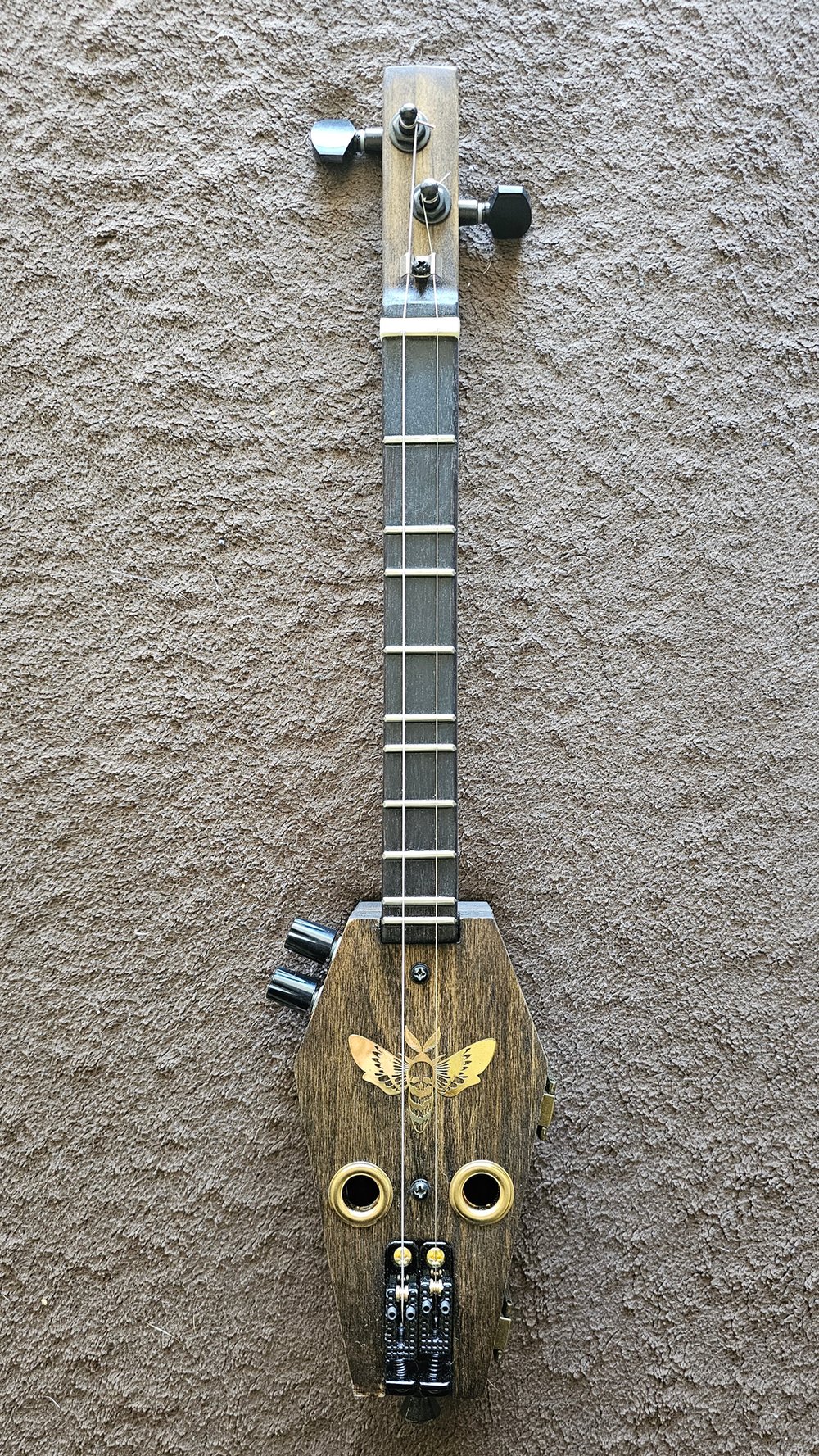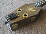 "Little Wing" is a very petite build coming in at over three inches (7cm) shorter than a soprano ukelele. The walnut-stained coffin box is just six inches (15.5cm) long. On the box lid is a golden death's head moth with twin soundholes and it surrounded and accented with gold, brass, and black hardware. Under the lid is the full set of electrics you'll find in one of my bigger builds. A Lucky 13 flat pup is tucked under the moth and there are tone and volume controls leading to a Puretone output jack.