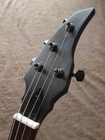This instrument utilizes black antique-style hardware and a rosewood trimmed four coil humbucker. The tone and volume knobs are recessed into the trim. A set of locking tuners can be found up at that flame-torched headstock.