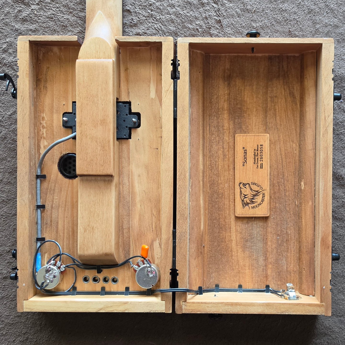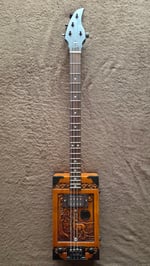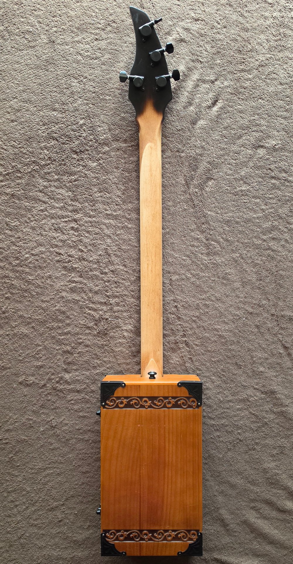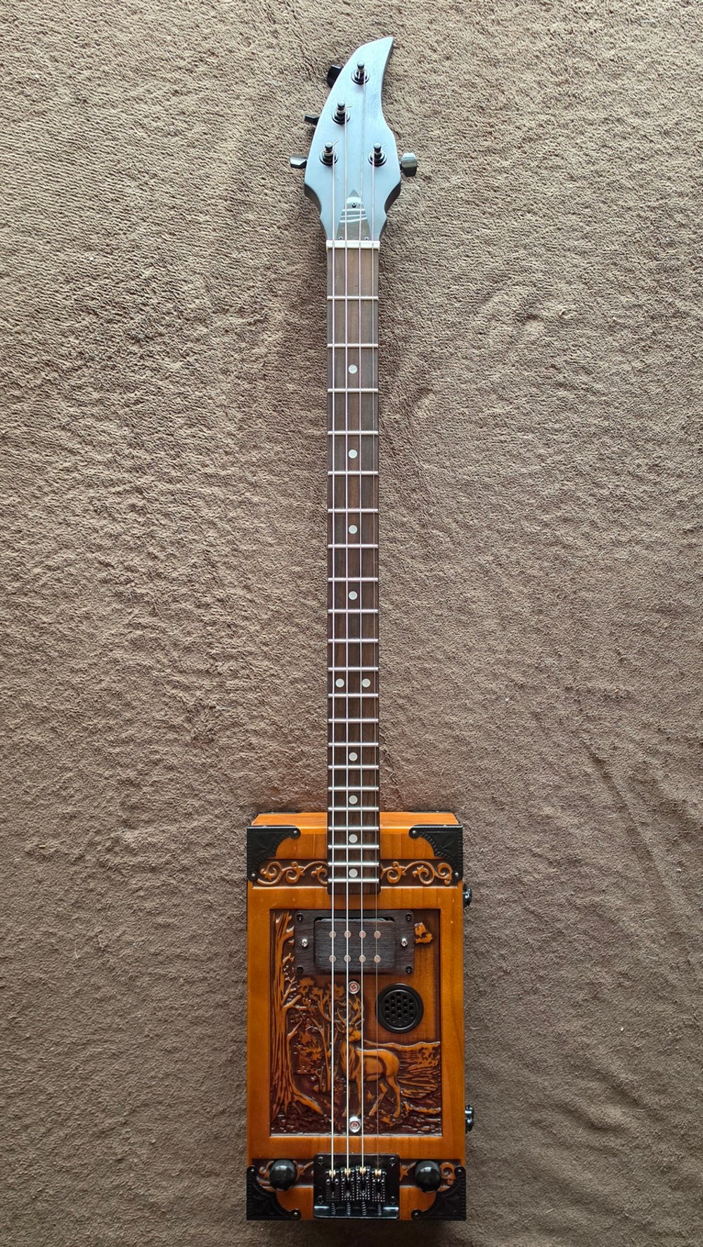"Sonas" started with the concept of using wooden urns to build instruments and other guitar accessories out of the wooden urns that would otherwise be used to hold ashes, and I started with this particular urn after seeing that pretty scrollwork and the lovely forest scene with the maple and the stag carved on the front. I knew it had to sing.