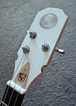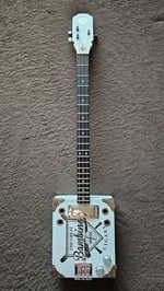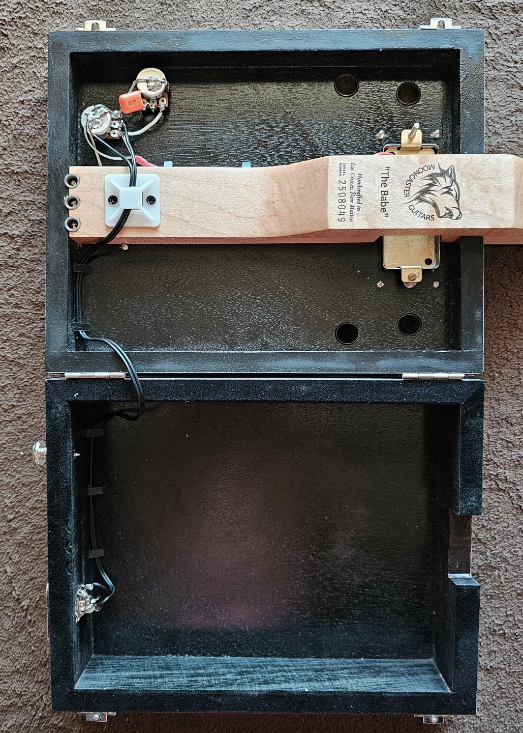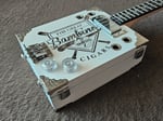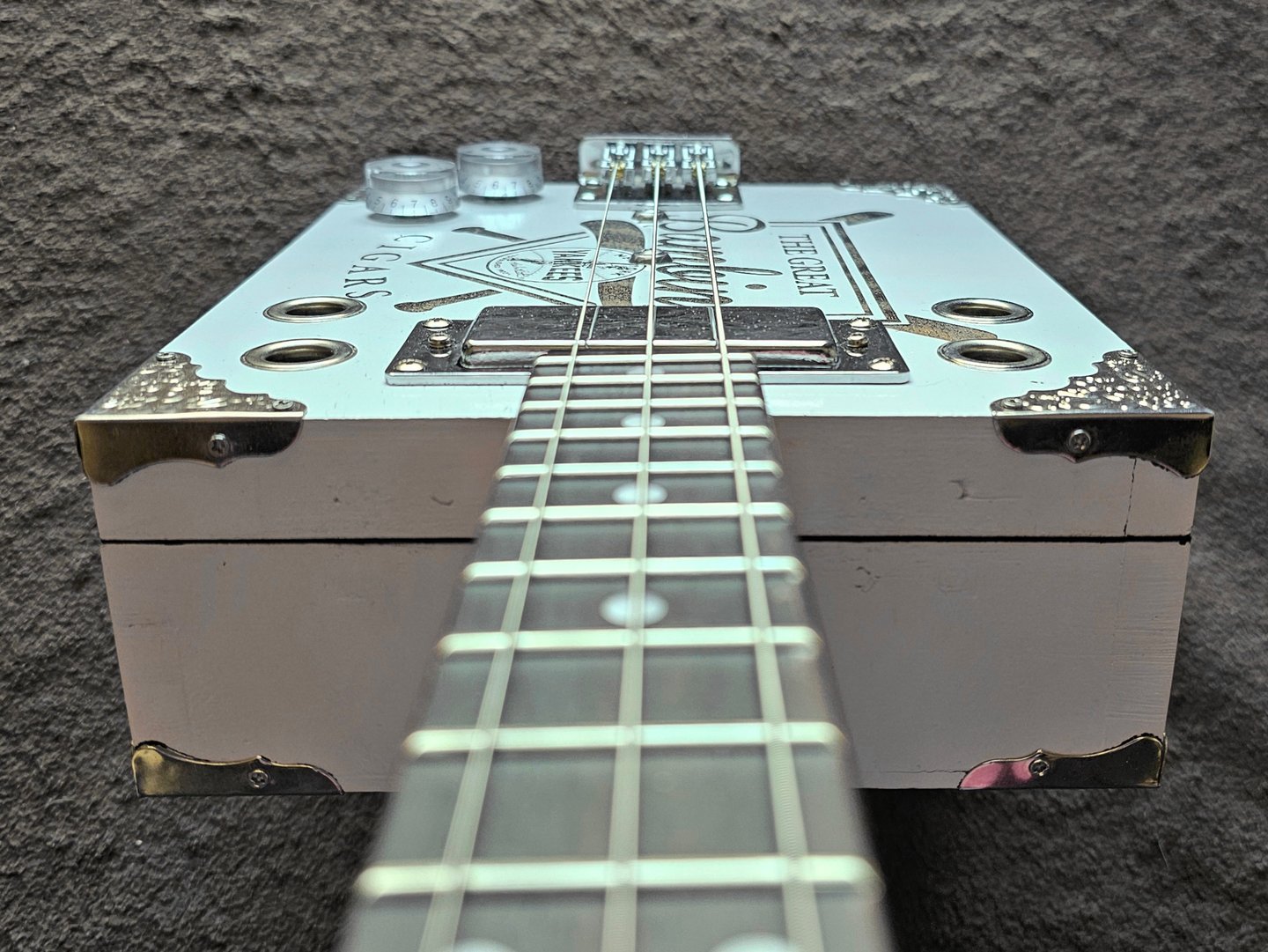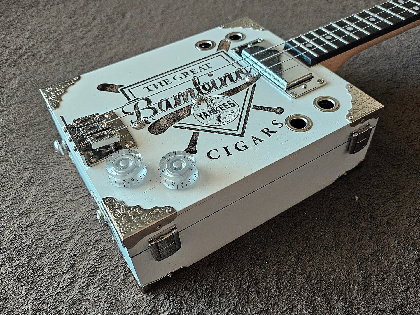 A custom, laser engraved logo features on the top of this heavily modified cigar box. A white owl with the Babe's signature is engraved on the back of the box. The neck and truss rod cover are hard maple with grain reminiscent of a good wooden slugger.The headstock is painted to match the box and features an inlaid commemorative coin to match the chrome hardware throughout this build and a spicy hot 14KΩ snake oil humbucker knocks out a bright, ballsey tone.